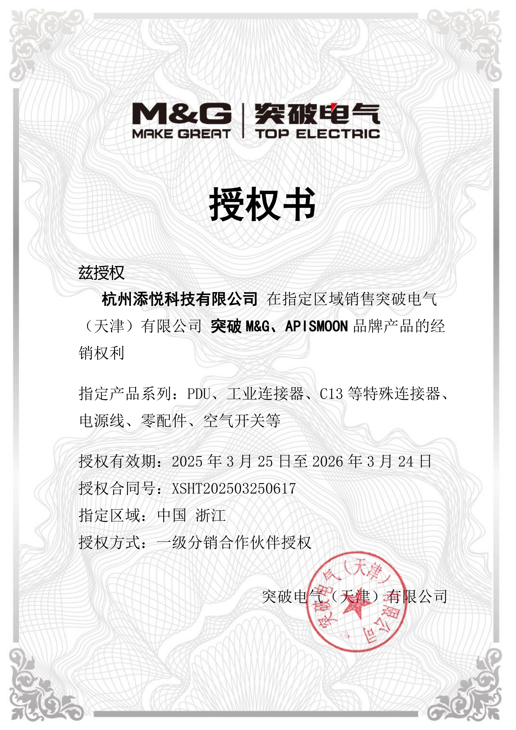 经过双方的友好协商与共同努力,杭州添悦科技有限公司正式成为突破电气(天津)有限公司在浙江区域销售突破M&G、APISMOON品牌的一级分销合作伙伴。