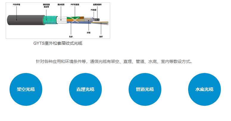 通信光缆自70年代开始应用以来,现在已经发展成为长途干线、市内电话中继、水底和海底通信以及局域网、专用网等有线传输的骨干,并且已向用户接入网发展,由光纤到路边(FTTC)、光纤到大楼(FTTB)等向光纤到户(FTTH)、光纤到桌面(FTTD)发展。通信光缆主要用于电信网络运营商(电信、联通、移动)中的核心骨干网以及接入网中,也用于交通运输、广播电视、石油化工、教育、医疗、商贸等各个行业。
