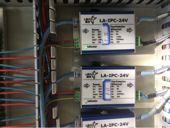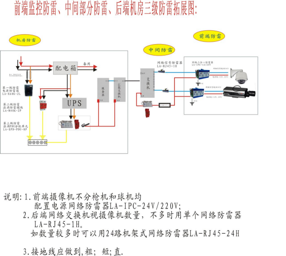 室外防雷——1个网络摄像机220V统一供电网线传输,监控系统前端枪机处电源、网络信号的防雷措施应分为二级防护。一级电源用雷傲电源模块(LA-M20K-2P)把监控前端电源220V保护起来。二级则摄像机取电网络部分。用1套LEIA雷傲网络+电源二合一防雷器LA-IPC-24V这样才能更好的达到防护作用,连接扩展图如下: