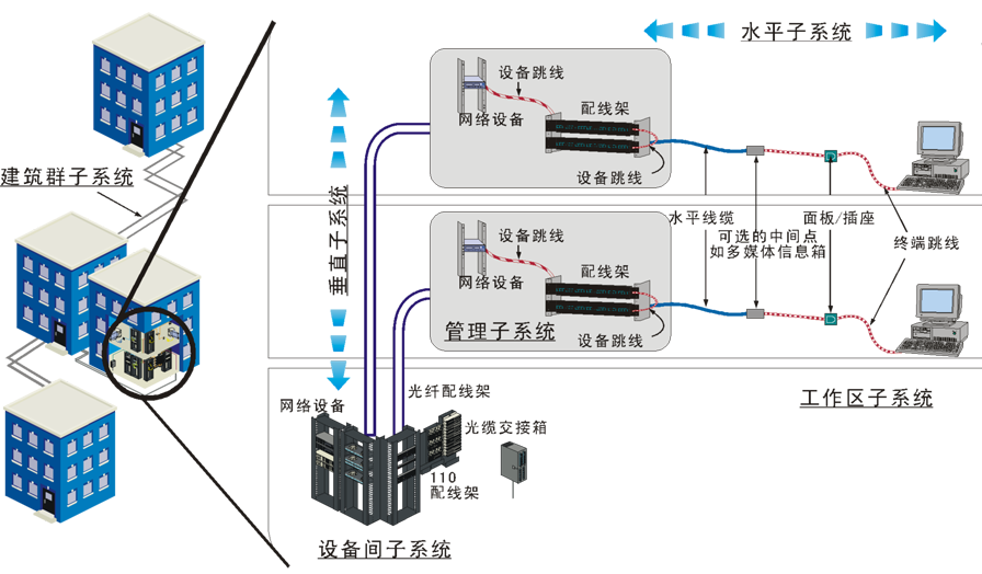 管理子系统三种应用:水平/干线连接;主干线系统互相连接;楼层设备的连接。线路的色标标记管理可在管理子系统中实现。